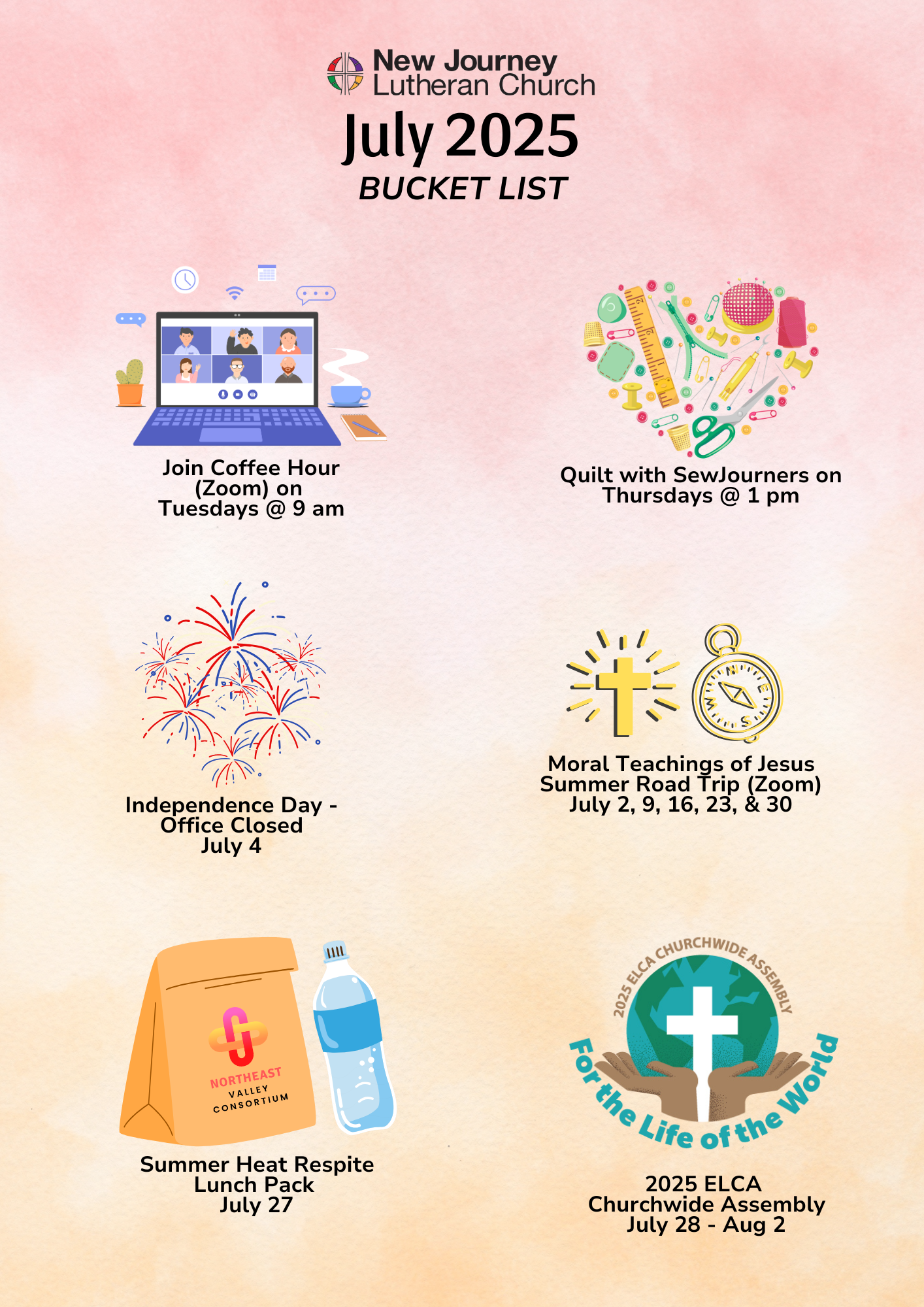 July is a time to grow in faith, build community, and enjoy God’s blessings. Join us this month for worship, fellowship, and fun church activities for all ages. Let’s make the most of July together!
