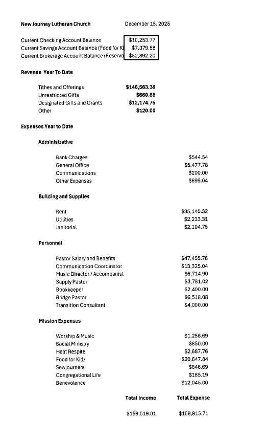 Financial Update – December 15, 2025 Dec 19 Written By New Journey Lutheran How Are We Doing Financially? December 15, 2025 New Journey Lutheran