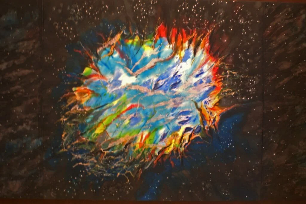Heaven is translated in Aramaic as the universe. Creating a visual representation of the first petition involved a process of layering. Using photographs taken by NASA’s Hubble Telescope as a guide, I stretched raw white silk on a frame. Hand dying and then painting the silk, I created an artistic representation using the color descriptions provided by NASA. “Crab Nebula” images in a mosaic style a six light year wide expanding remnant of a star’s supernova explosion.