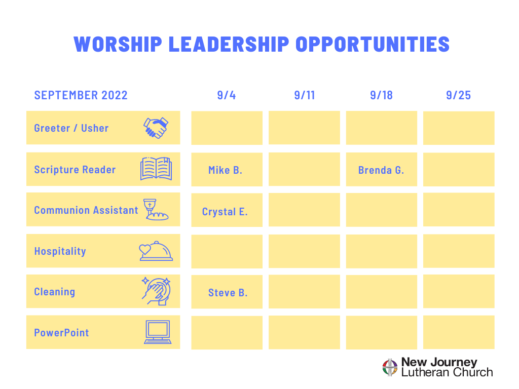 Time is a precious resource to be shared, and there are numerous opportunities to volunteer your time at New Journey Lutheran Church. Thank you for volunteering using the form below.